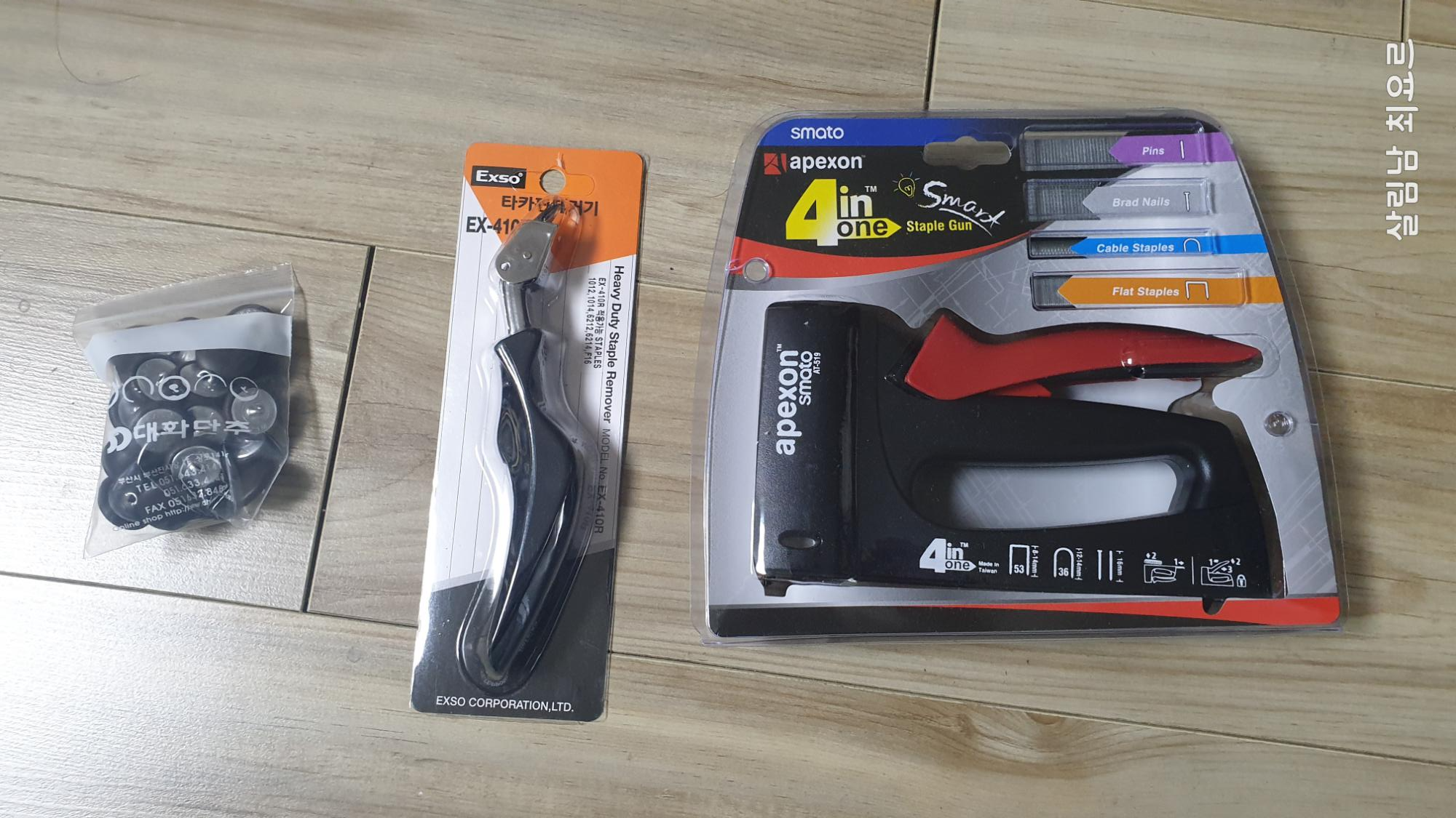 타카, 타카제거기, 가죽, 단추를 구매하였다.