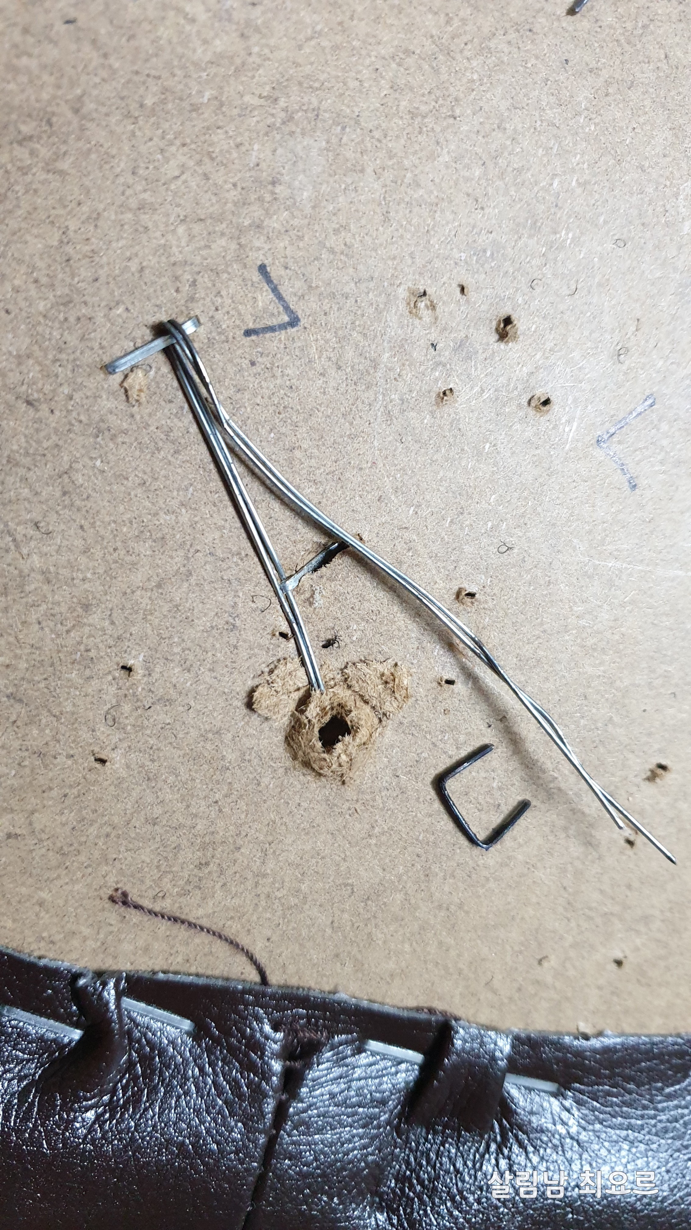 드라이버를 가죽 부분으로 넣어서 길을 확인한 후 철사를 넣어준다.